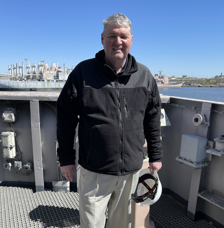 Perry Shipyard Executive Director and CEO Joe Pfadt, Ph.D., stands on the deck of the ex-USS HALYBURTON in Philadelphia during a visit to the ship.