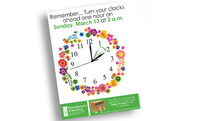 It’s time to spring forward! Daylight-Savings Time begins at 2 a.m. Sunday, March 13. Manufacturer & Business Association members...
